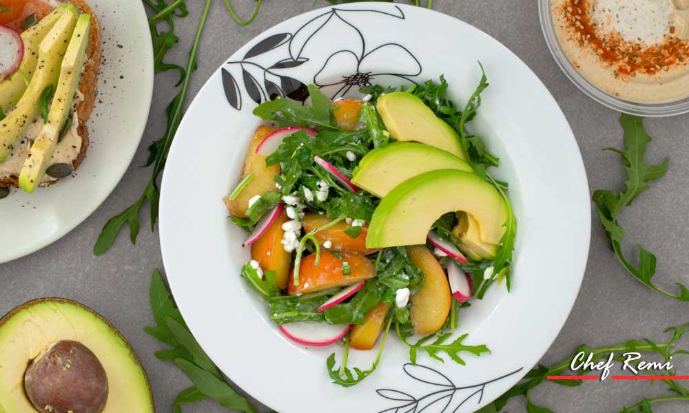 - In your salad / presentation bowl, place the arugula, peach slices and avocado slices. Drizzle over the Champagne peach vinaigrette and toss through.