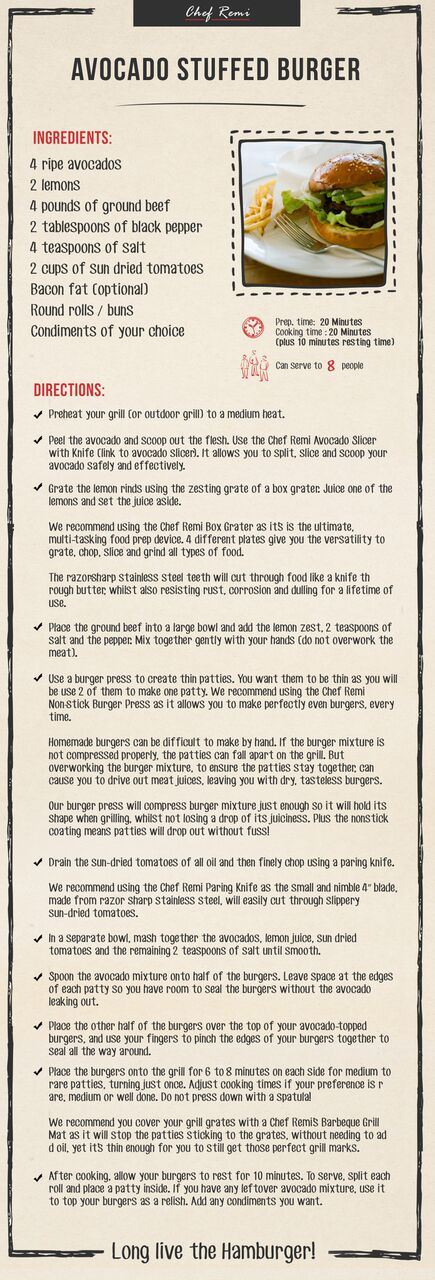 It’s difficult to think of how a Hamburger can be made better, but I think I’ve done it with this avocado stuffed burger. Try it – you’ll be a convert!