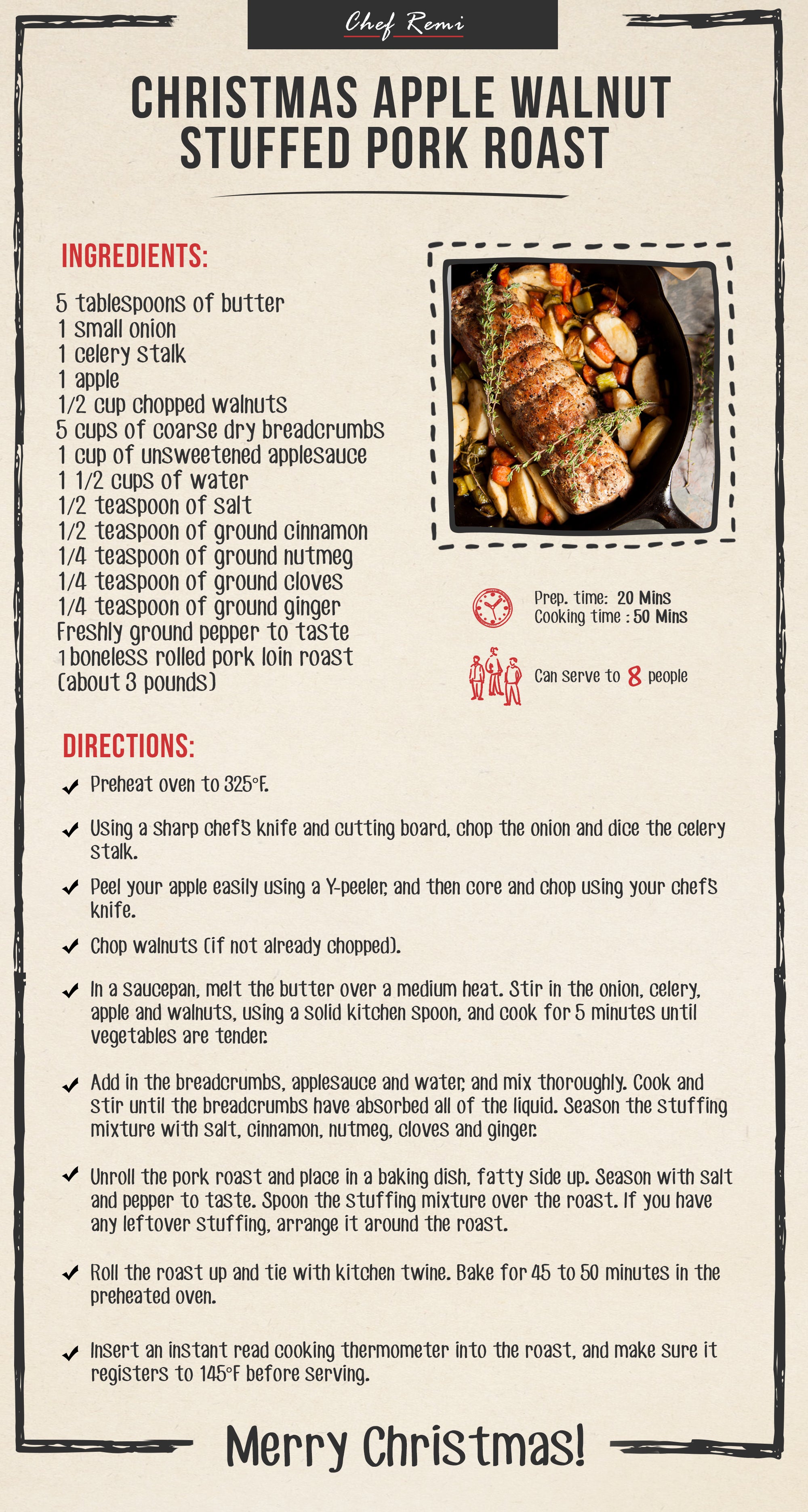 - Unroll the pork roast and place in a baking dish, fatty side up. Season with salt and pepper to taste. Spoon the stuffing mixture over the roast. If you have any leftover stuffing, arrange it around the roast.