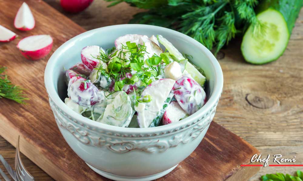 - In your salad / presentation bowl, place the cucumber and onion slices. Then, pour over your dressing and toss through.