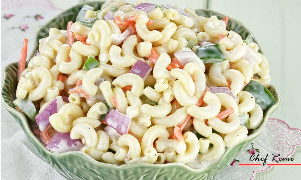 - In your salad / presentation bowl, place your macaroni, egg, bell pepper, carrots, celery and onion. Drizzle your dressing over.