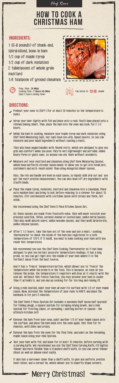 - While the ham is cooking, measure your maple syrup and dark molasses using Chef Remi Measuring Cups. Our cups have non-drip, lipped spouts, so you can measure and pour liquid ingredients without causing a mess.