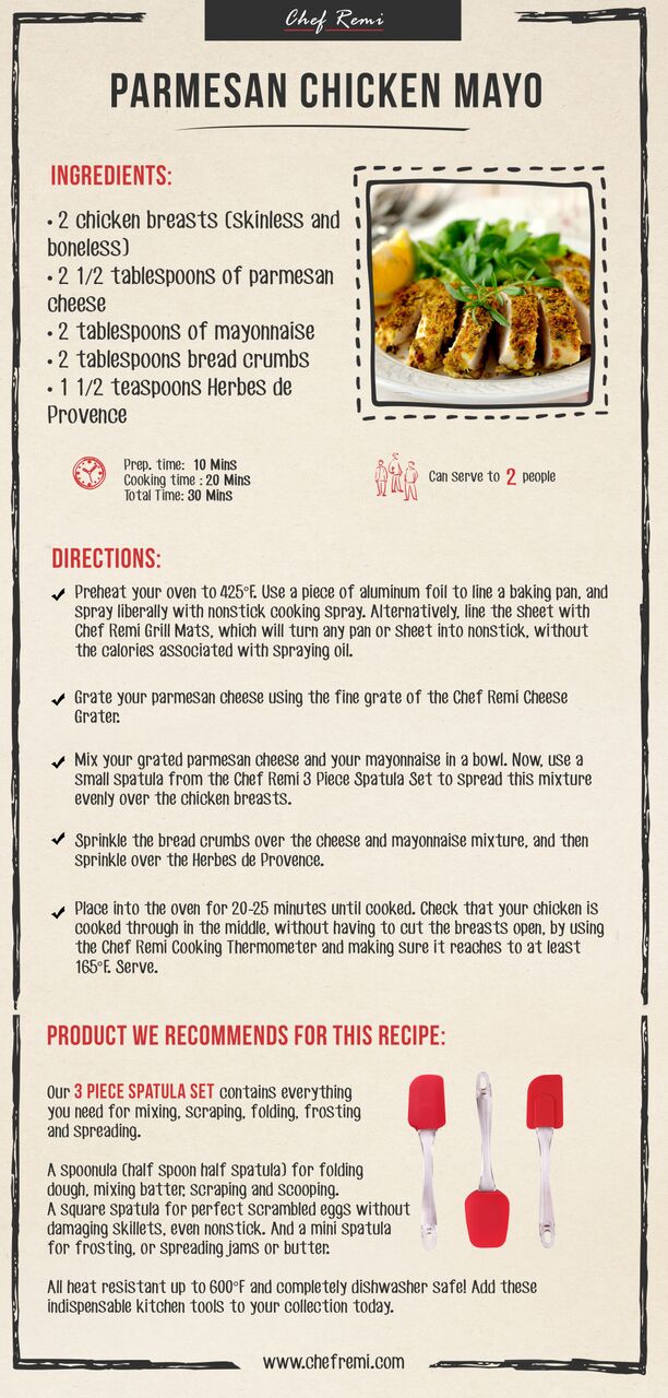 - Mix your grated parmesan cheese and your mayonnaise in a bowl. Now, use a small spatula from the Chef Remi 3 Piece Spatula Set to spread this mixture evenly over the chicken breasts.