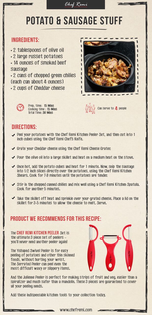 - Once hot, add the potato cubes and heat for 1 minute. Now, snip the sausage into 1/2 inch slices directly over the potatoes, using the Chef Remi Kitchen Shears. Cook for 7-9 minutes until the potatoes are tender.