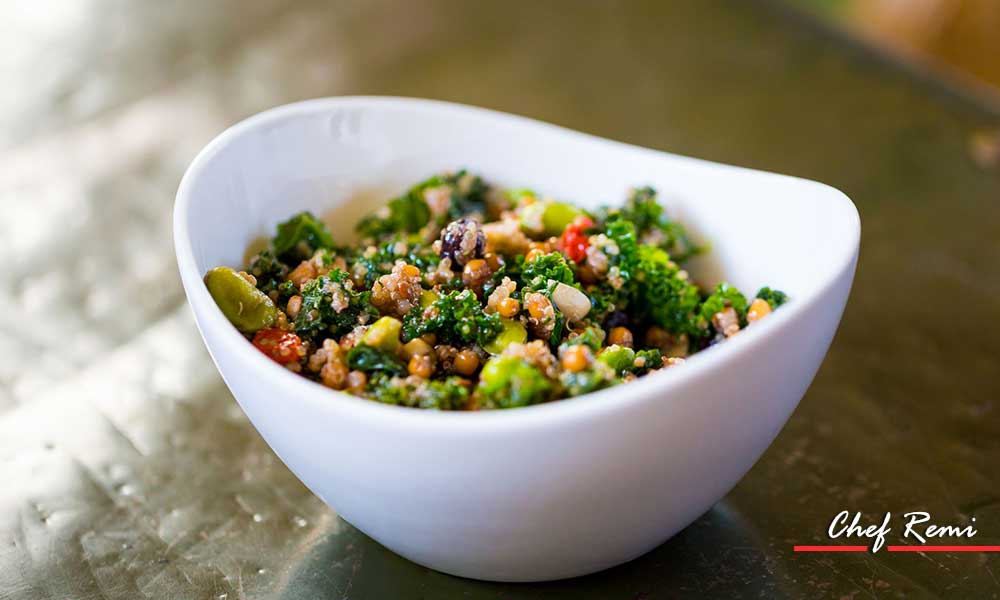 - In your salad bowl / presentation bowl, place the kale, romaine and quinoa.